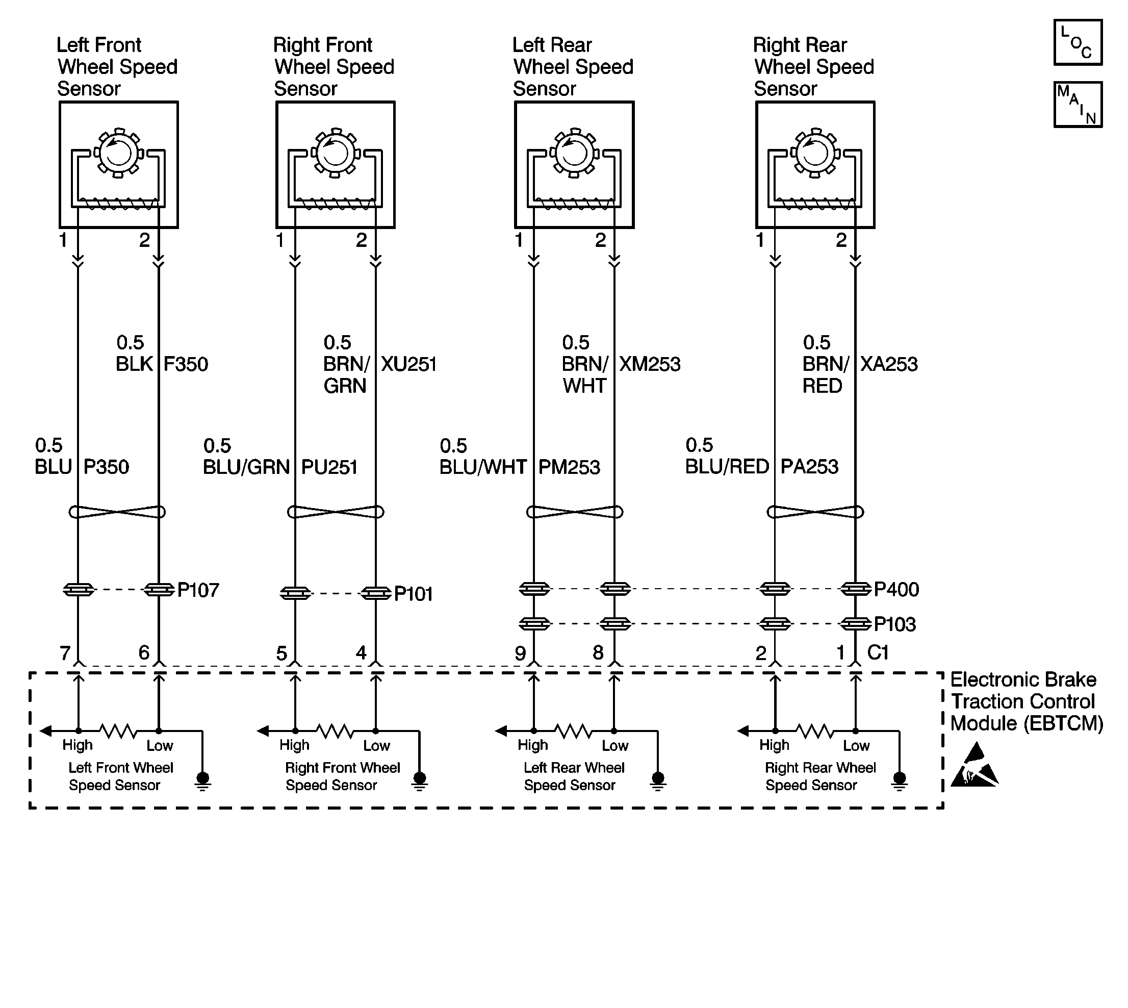The speed sensor used on this vehicle is a single point magnetic pickup. This sensor produces an AC signal that the EBTCM uses the frequency from to calculate the wheel speed.